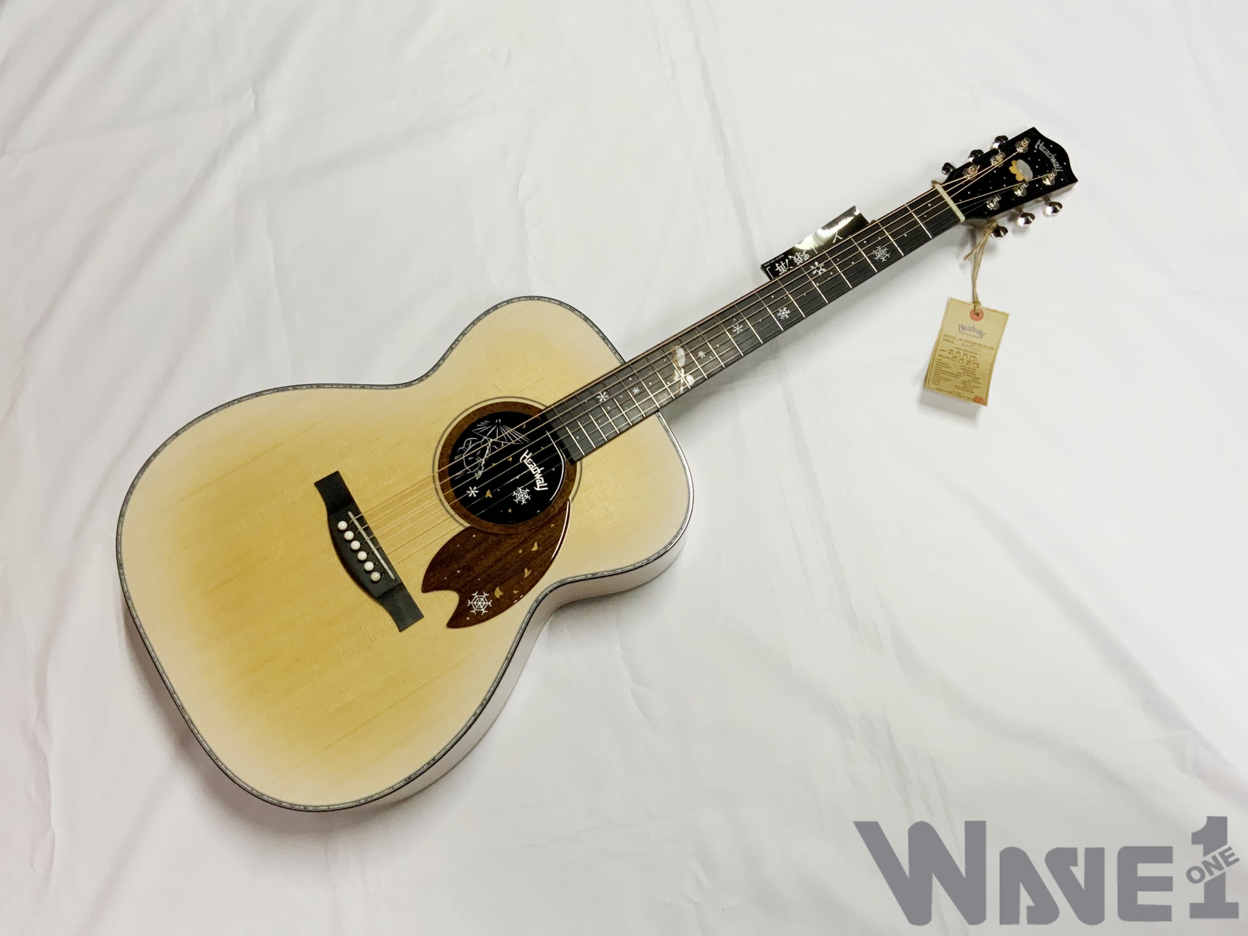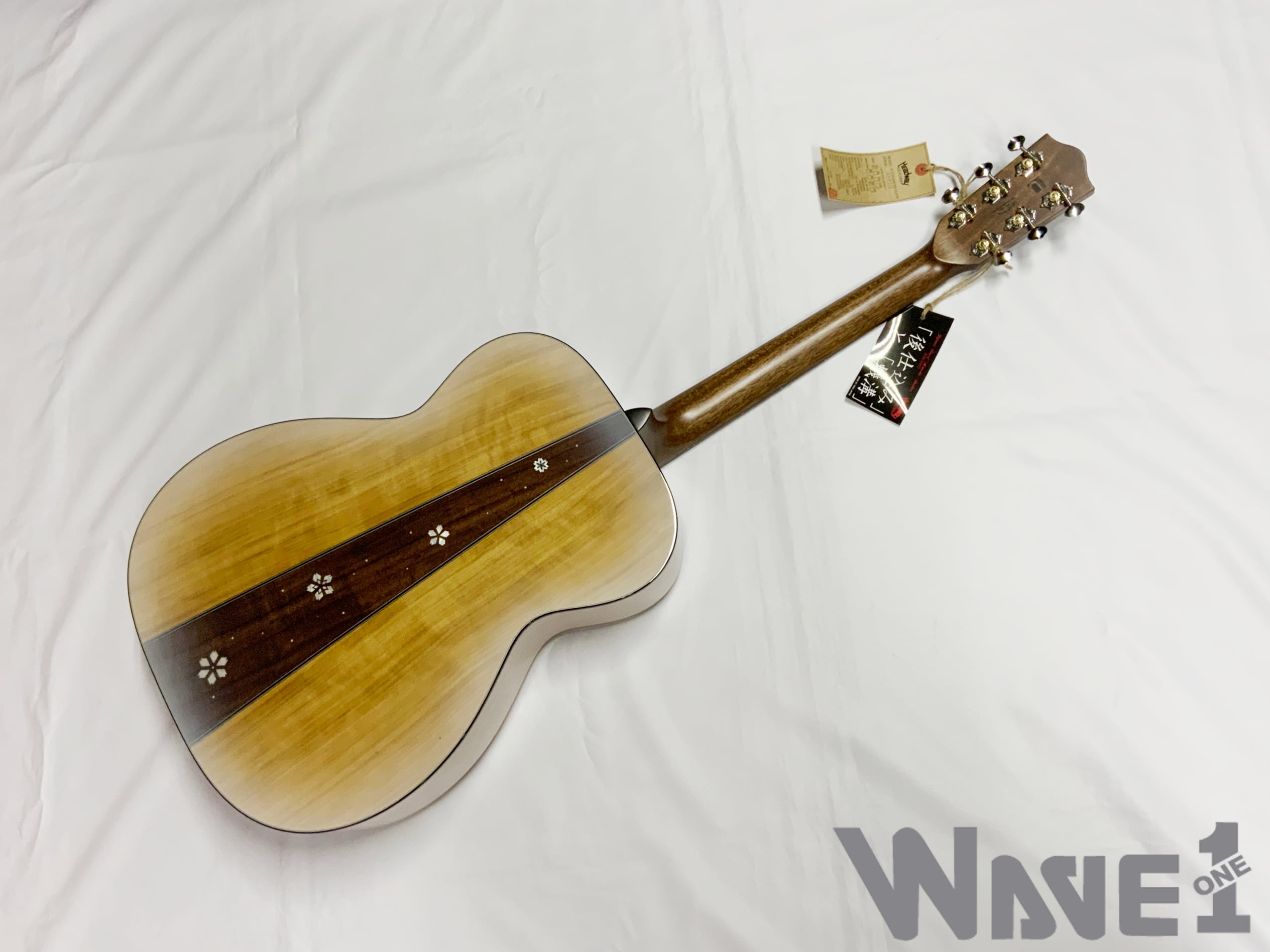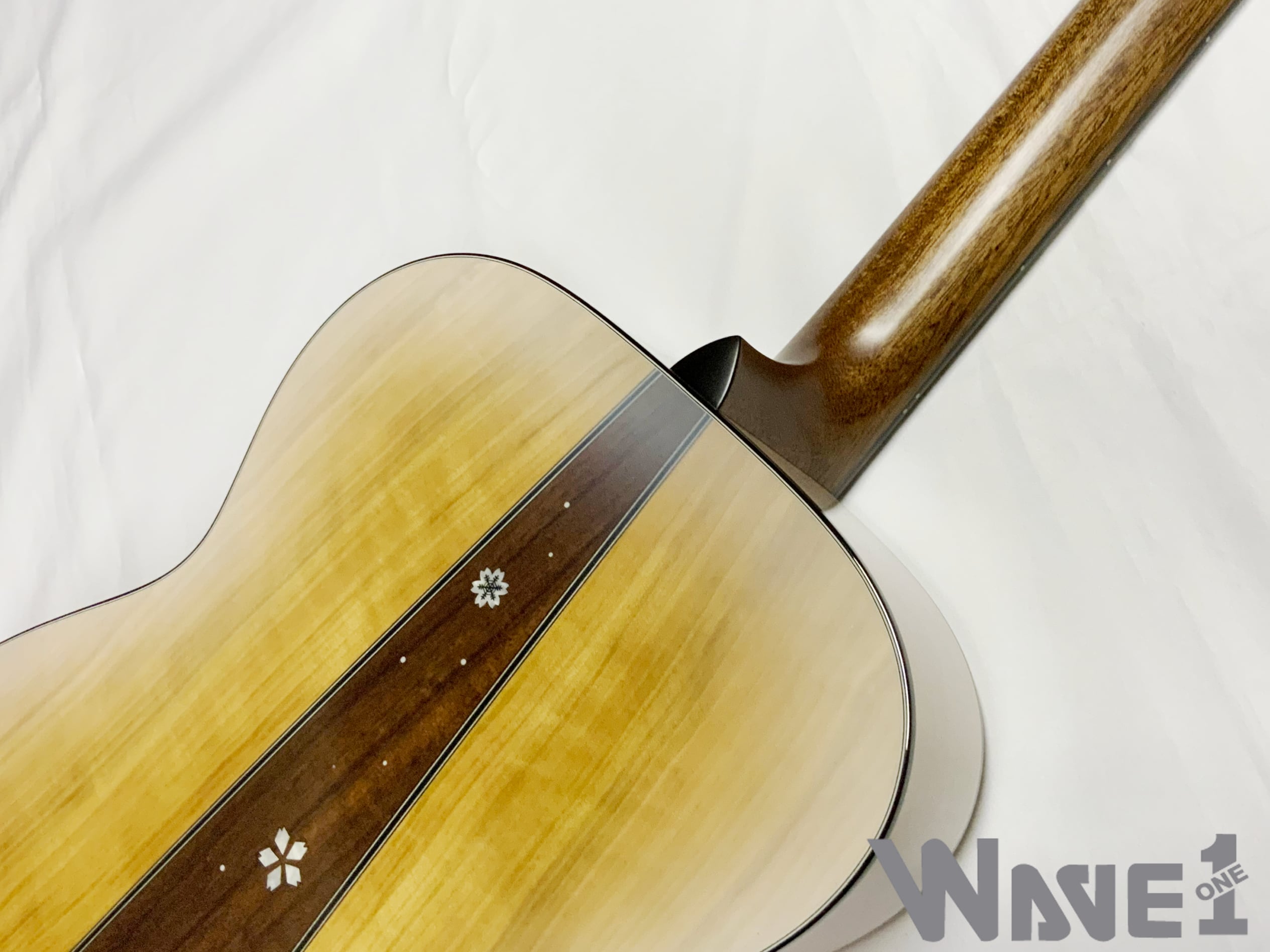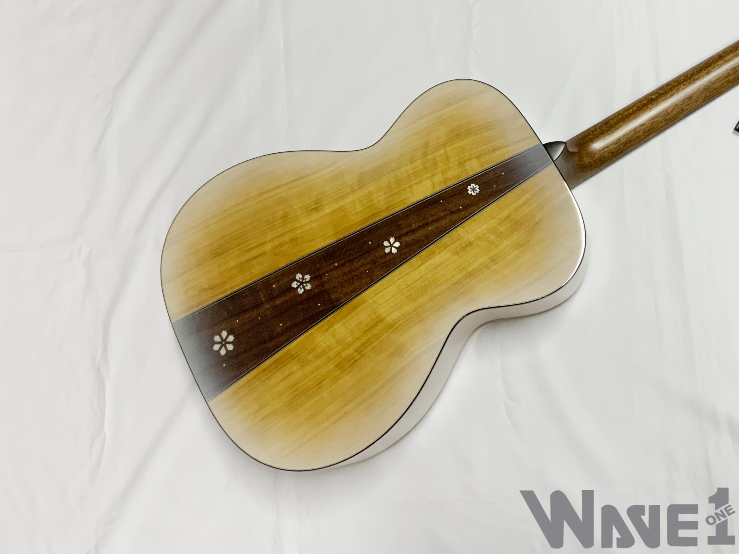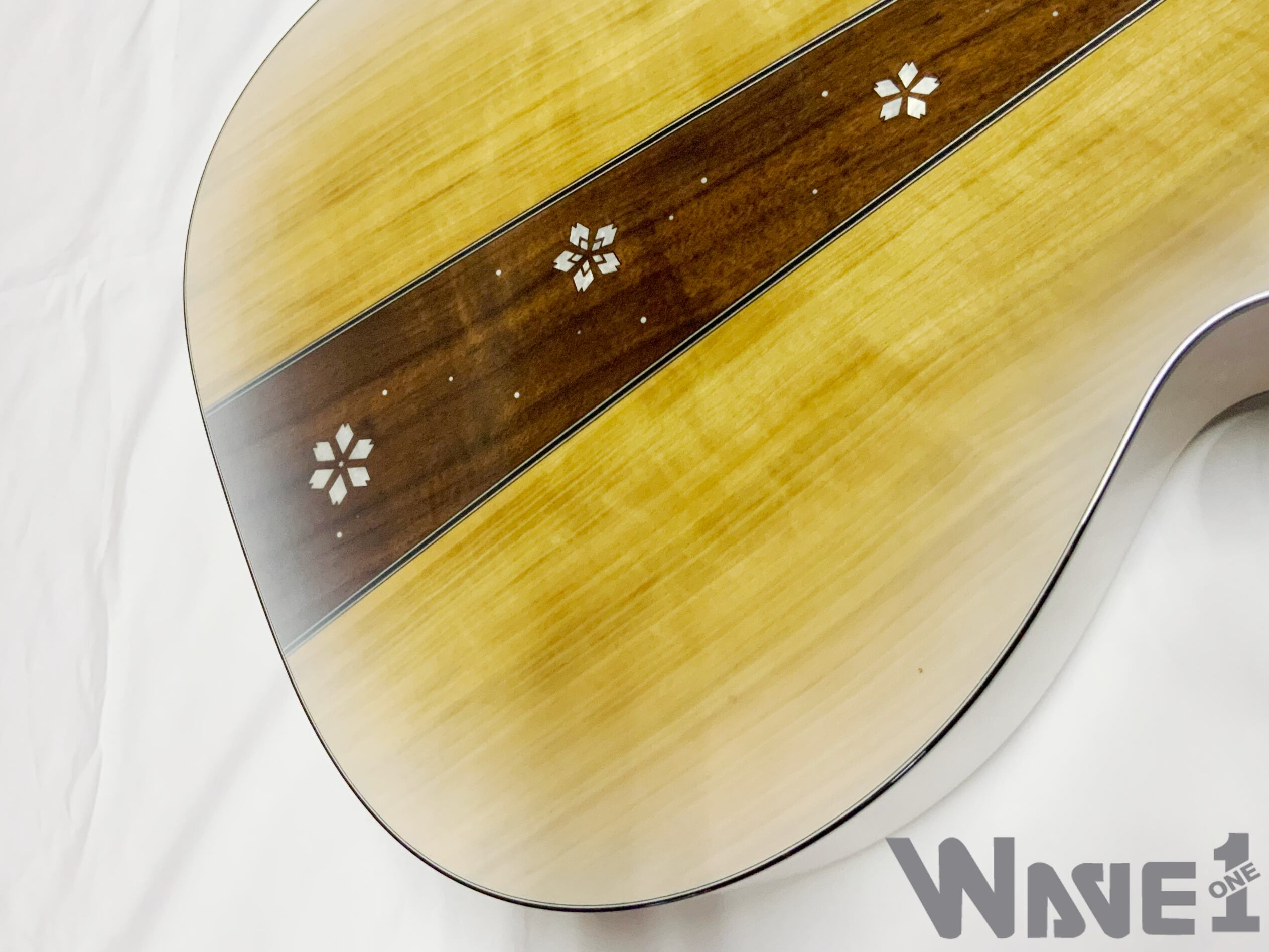 ヘッドと指板には、桜材と“舞い降る雪”を組み合わせたデザインを採用しています。桜の部分は実際に桜の木材を使用し、舞い降る雪にはアクリルや白蝶貝を用いています。木の温もりと雪のきらめきが穏やかに調和した、美しい情景を思わせるデザインとなっています。