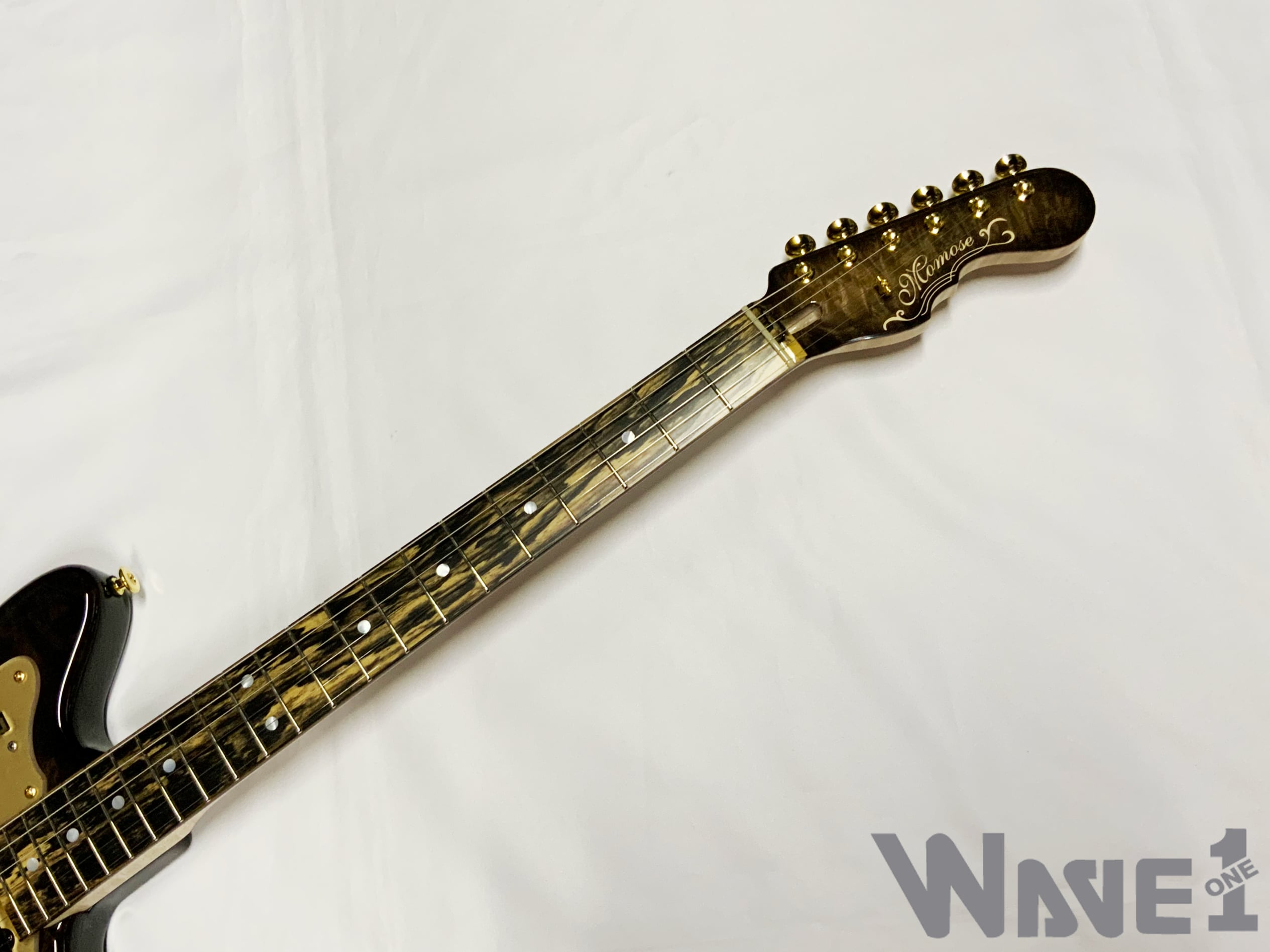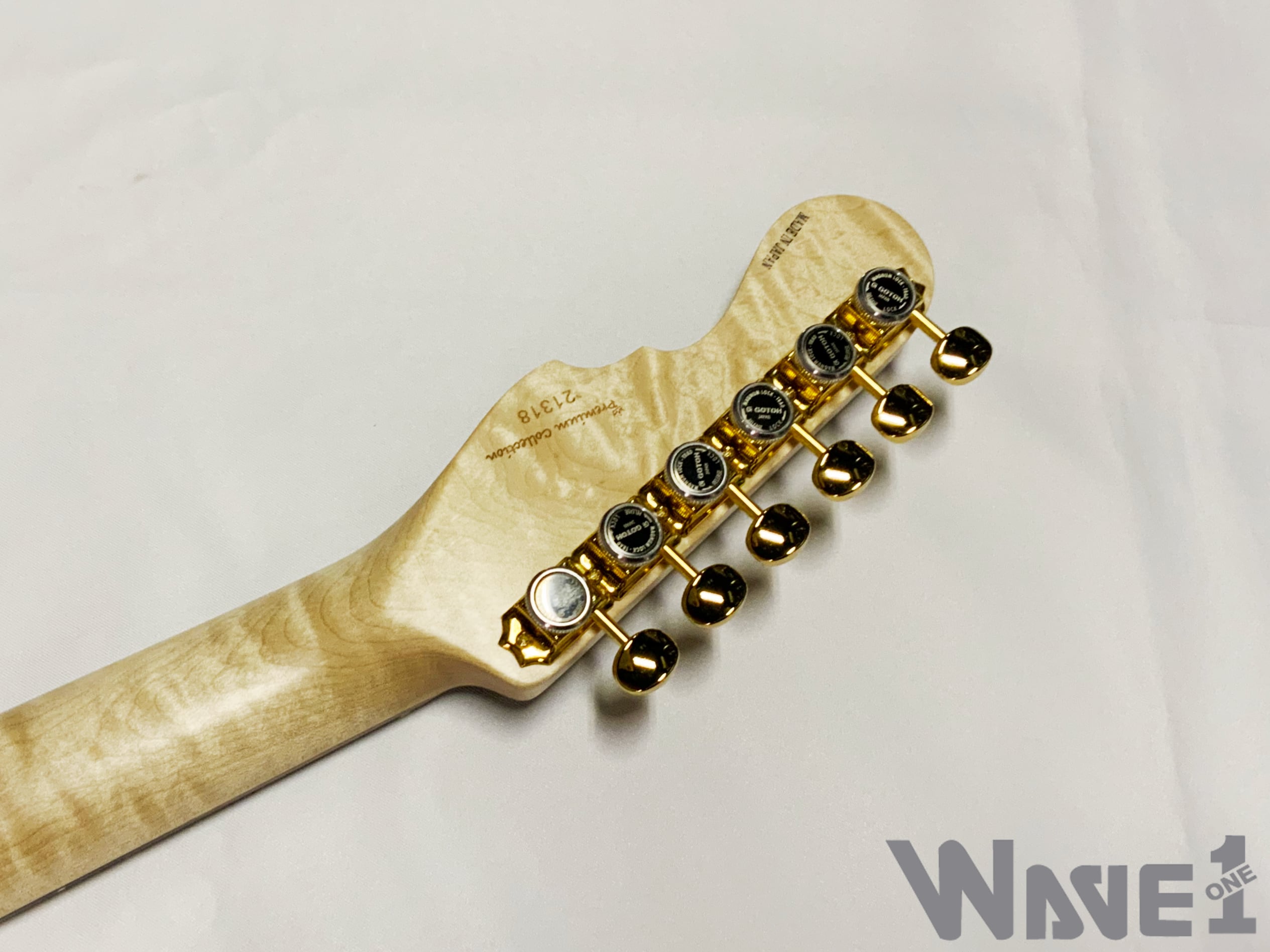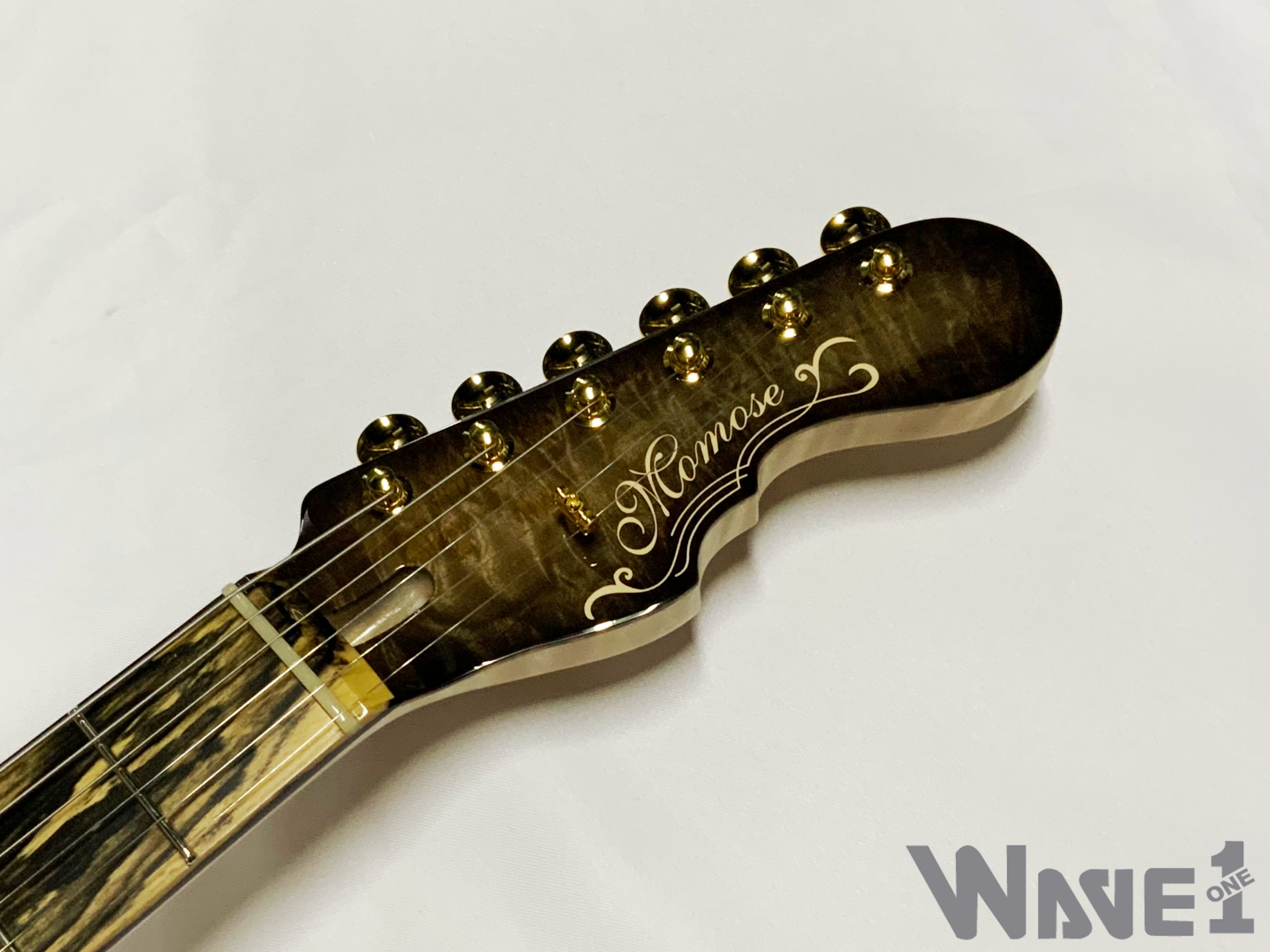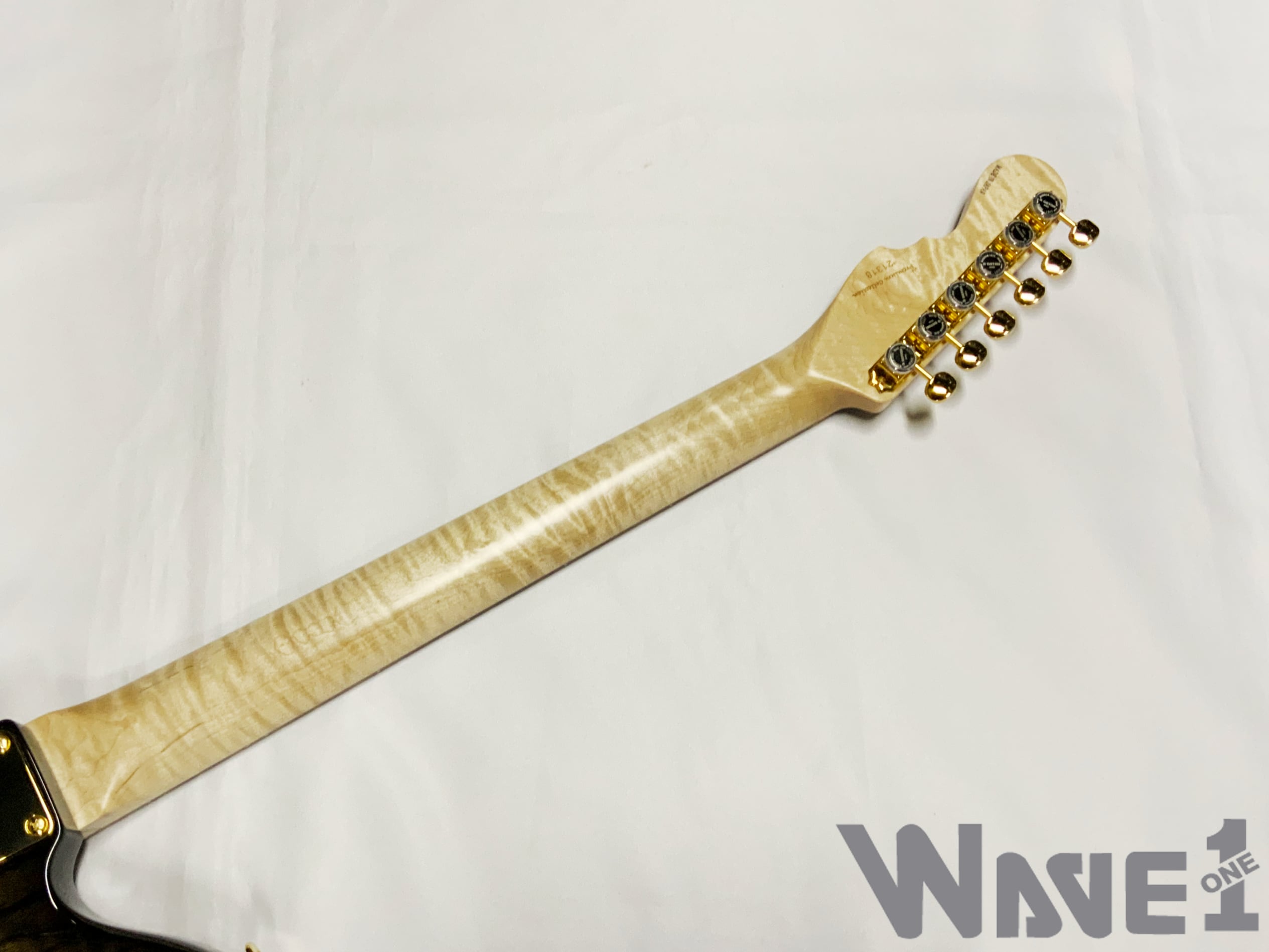 指板材にはペールムーンエボニーを使用。定番のローズウッドなどに比べて重量があり、音の立ち上がりが早く輪郭のあるトーンと伸びやかなサスティーンを生み出します。ネックにはヘッドストックの先端までストライプの入ったハイグレードのフレイムメイプルを選定。芸術的なルックスをぜひその目でお確かめください。