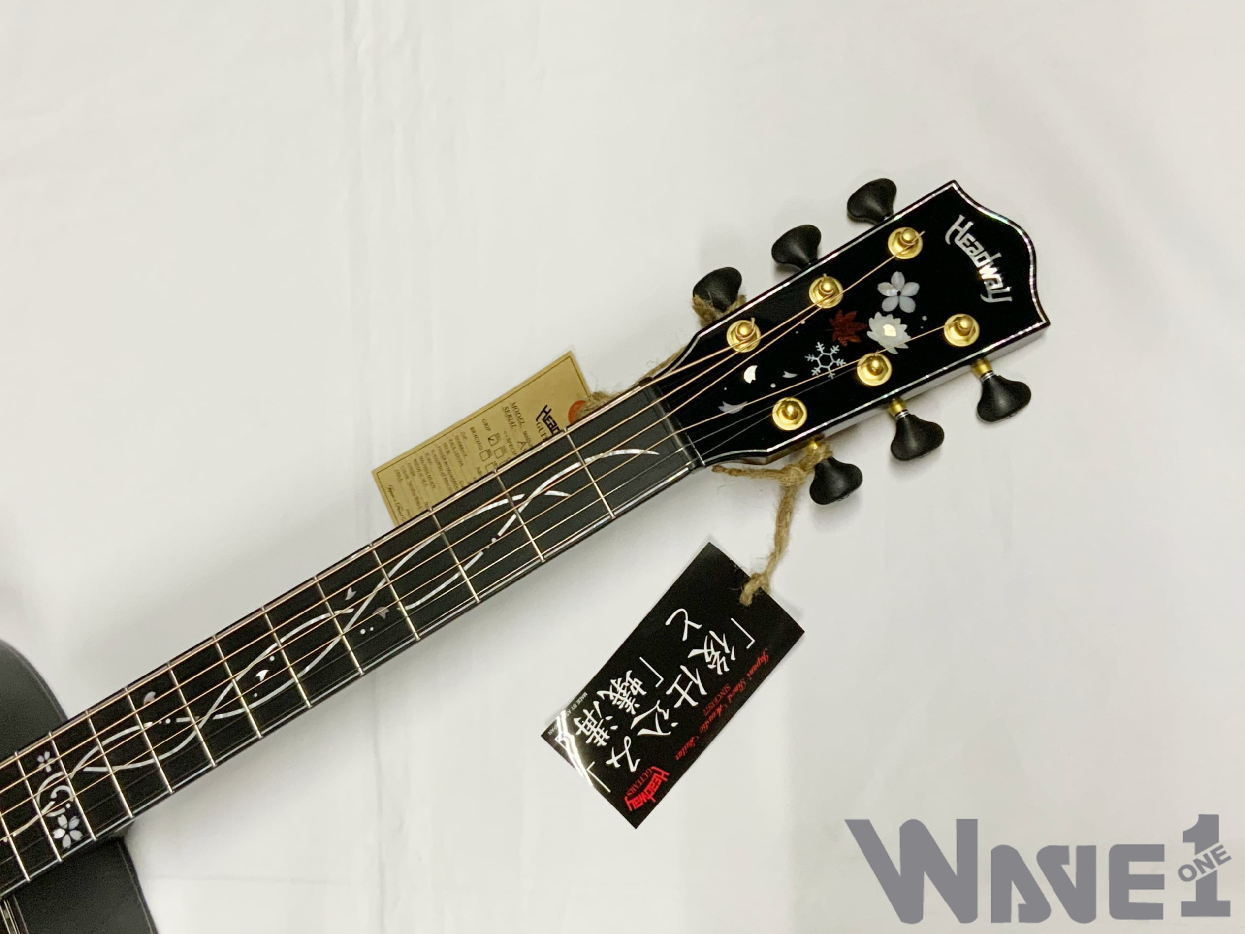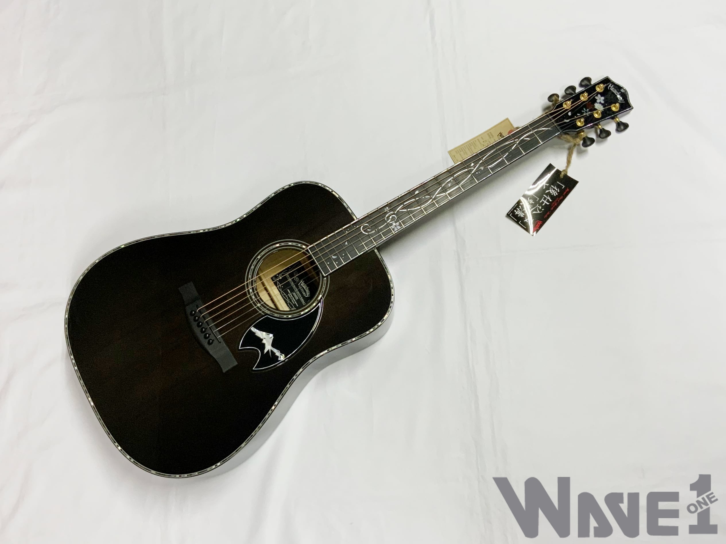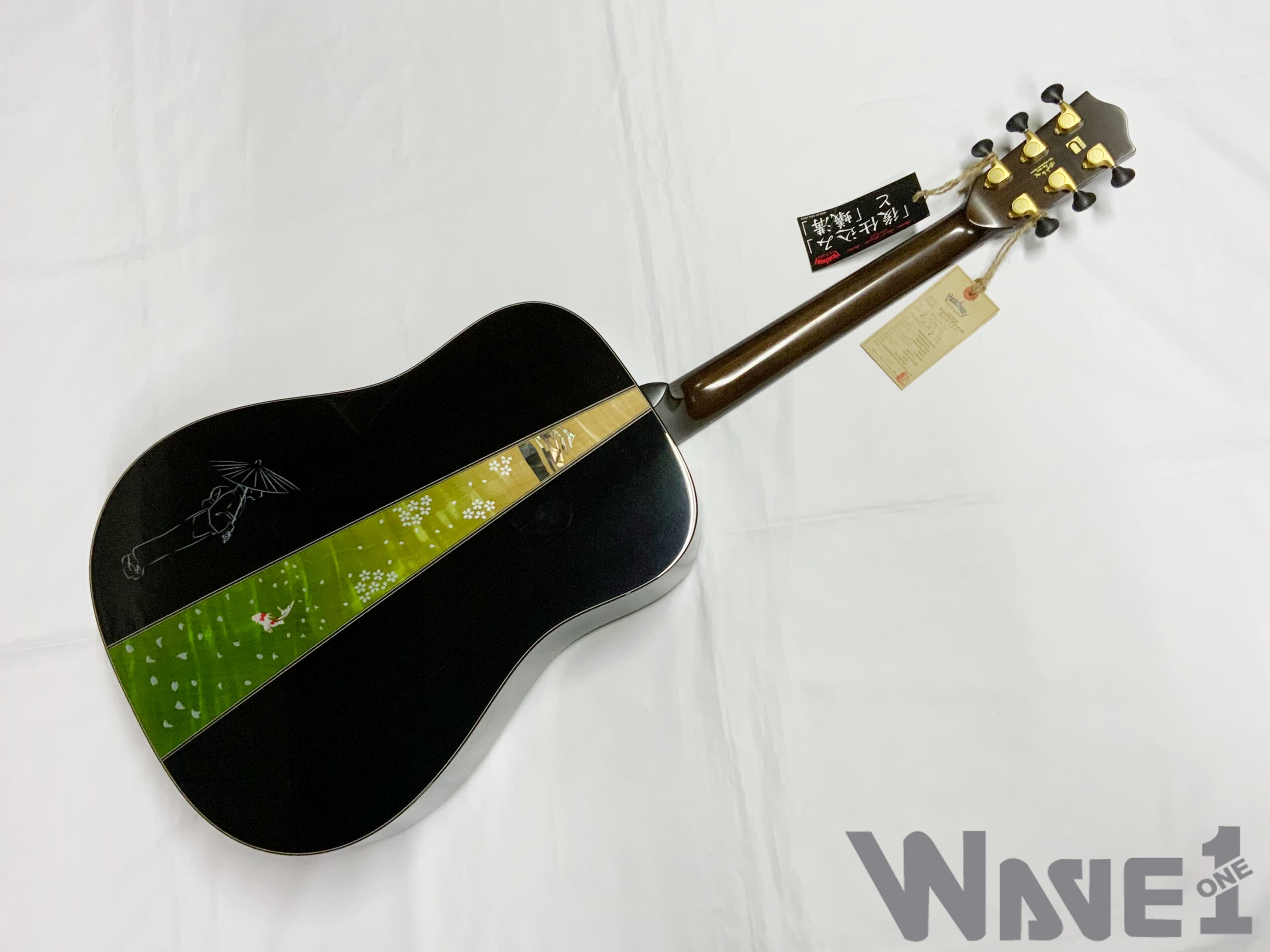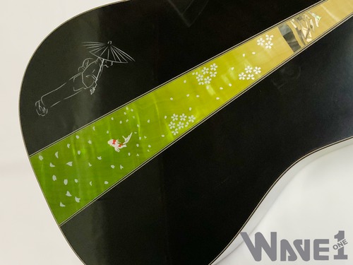 ボディのカラーリングは松本城の天守をイメージした”黒”で仕上げました。桜材の杢目を見せる黒の色合いは表現が難しく、数々のギターを塗り分けてきた職人の技と感覚で調色されています。